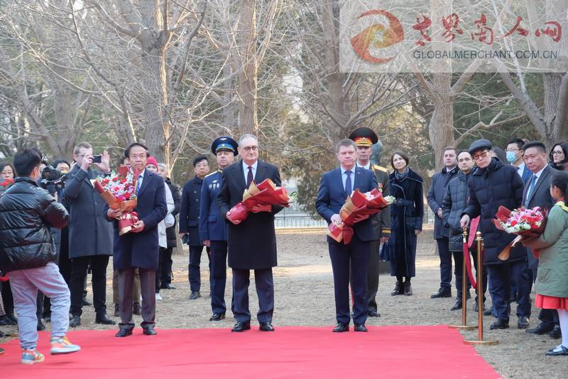 俄罗斯驻华大使伊戈尔·莫尔古洛夫阁下,白俄罗斯驻华大使尤里·先科阁下,中国著名雕塑家袁熙坤教授向“苏联飞鹰”敬献鲜花的仪式