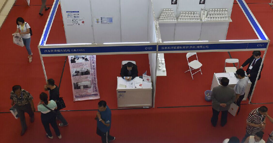 日本东洋铝爱科商贸有限公司展位前(右边展位)总经理中南善雄先生和搭档张峰在接待访客