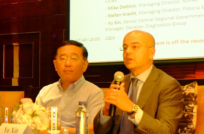 主讲嘉宾演讲后, 丹纳赫政府事务经理于欣女士、德鑫管理咨询公司总裁Stefan Kracht先生、药品研制和开发行业委员会总经理Mike Dethick先生在小组讨论中共同出席, 由中国欧盟商会的商业经理米福先生主持会议。