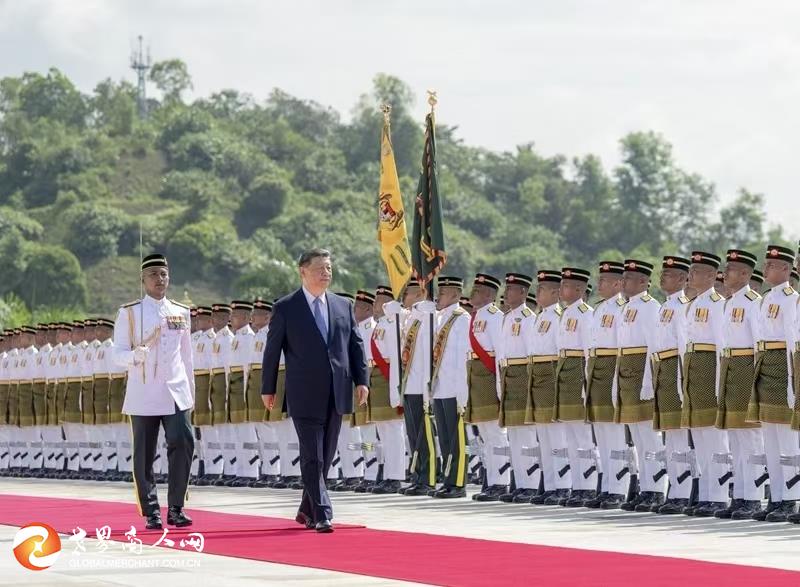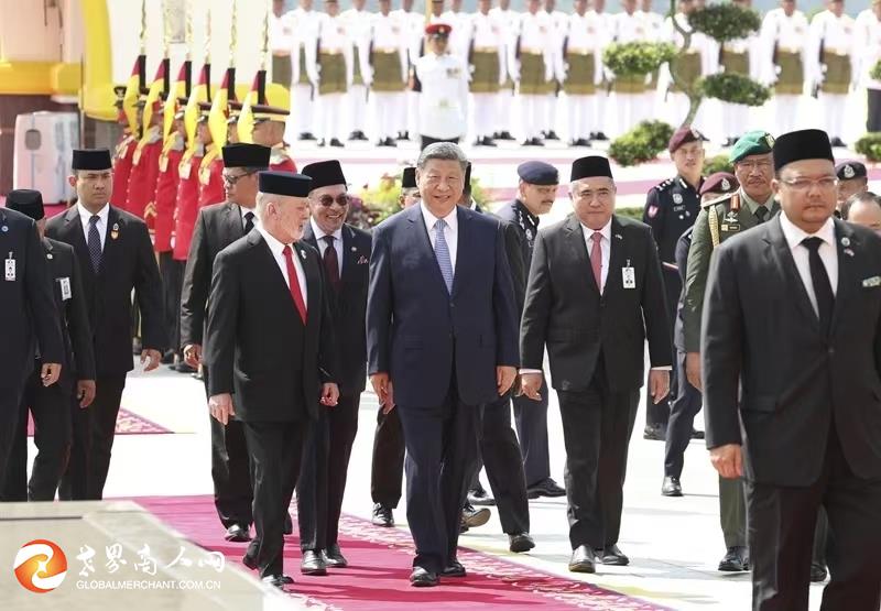 习近平乘车抵达时,易卜拉欣和马来西亚总理安瓦尔在下车处热情迎接。两国元首登上检阅台,军乐团奏中马两国国歌,鸣礼炮21响。习近平检阅仪仗队。两国元首进入国家王宫大厅,同双方陪同人员握手致意。