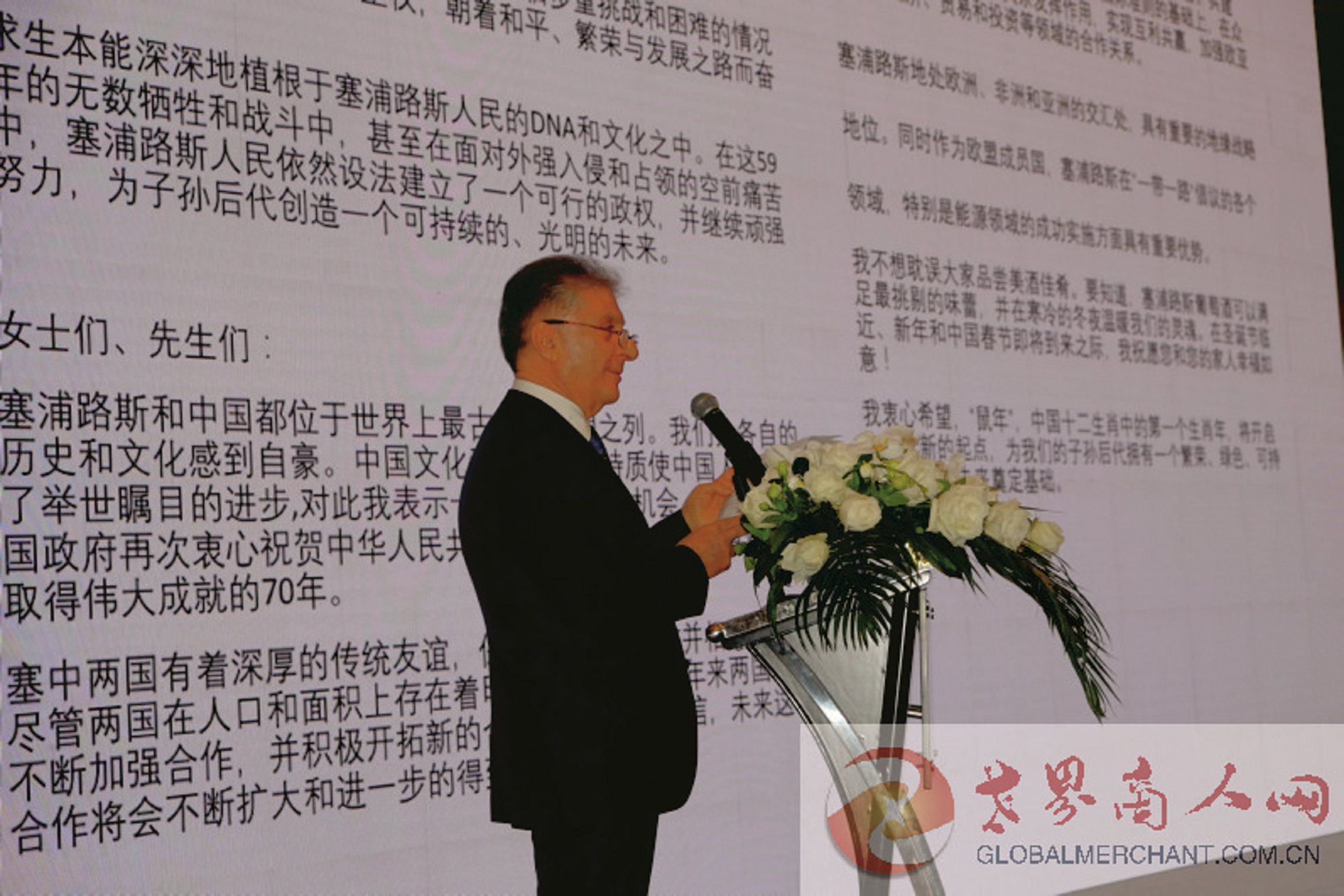 “女士们先生们,塞浦路斯和中国都位于世界上最古老的文明之列。我们为各自的历史和文化感到自豪。中国文化和智慧中的特质使得中国人民取得了举世瞩目的进步,对此,我表示十分钦佩。借此机会,我谨代表我国政府在此表示衷心祝贺中国成立70周年,这是中华民族取得伟大成就的70年。塞中两国有着深厚的传统友谊,保持着紧密的合作并相互理解。尽管两国在人口和面积上存在着明显的差异,但近年来两国之间不断加强合作,并积极开拓新的合作领域。我们相信,未来这种合作将会不断扩大和进一步得到充实。”