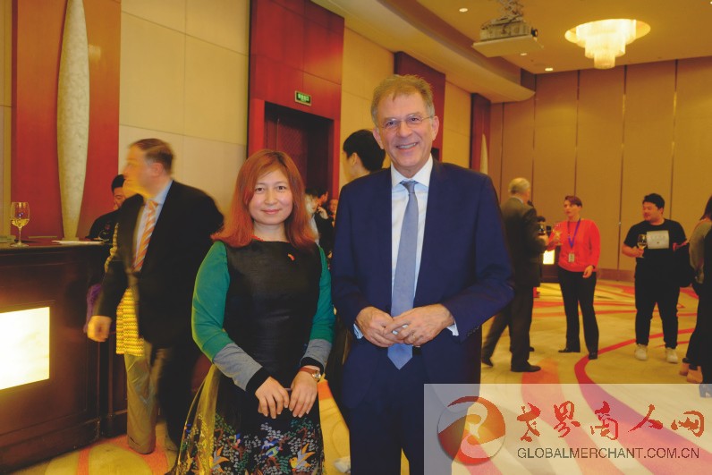 环球云链·世界商人网主编王晓玲向希腊新任驻华大使阁下(右)介绍环球云链国际旅行社和世界商人网并愉快合影!