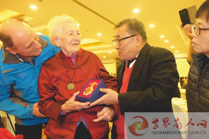中国国际友人研究会常务副会长顾品锷先生(右2)向伊莎白·柯鲁克女士颁发“国际友人纪念章”。
