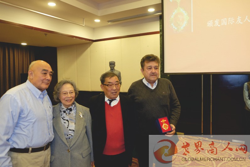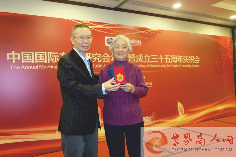 中国国际友人研究会常务副会长顾品锷先生向有杰出贡献的老外交家颁发“国际友人纪念章”