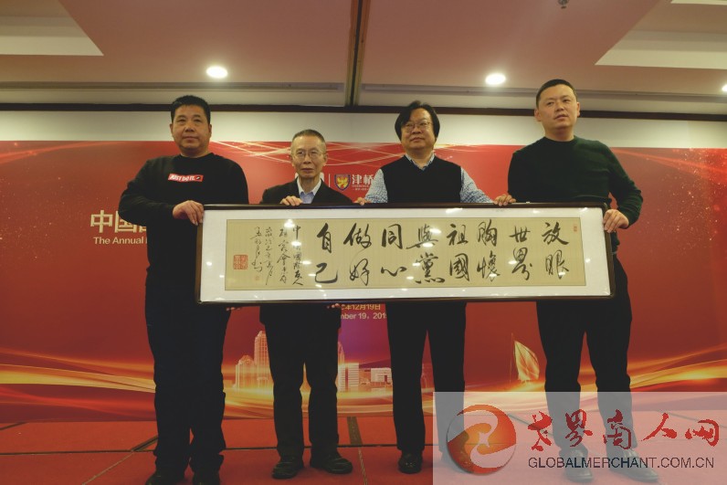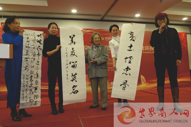 中国国际友人研究会刘昕生副会长(左2)代表中国国际友人研究会年会接受字画捐赠:我们的朋友遍天下