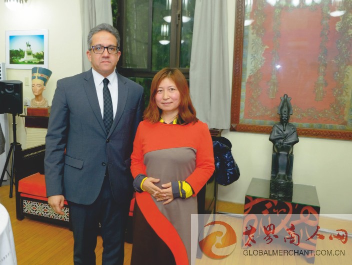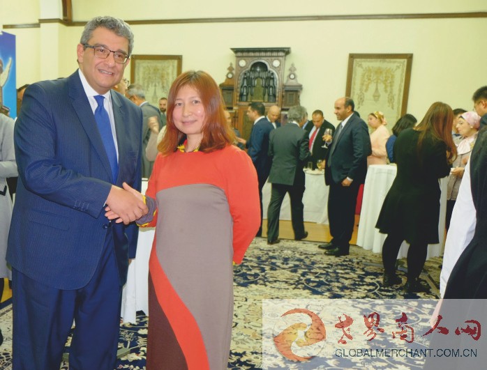 环球云链·世界商人网主编王晓玲向埃及埃及新任驻华大使穆罕默德·巴德里阁下在埃及文物新闻发布会后介绍环球云链国际旅行社和世界商人网并愉快合影