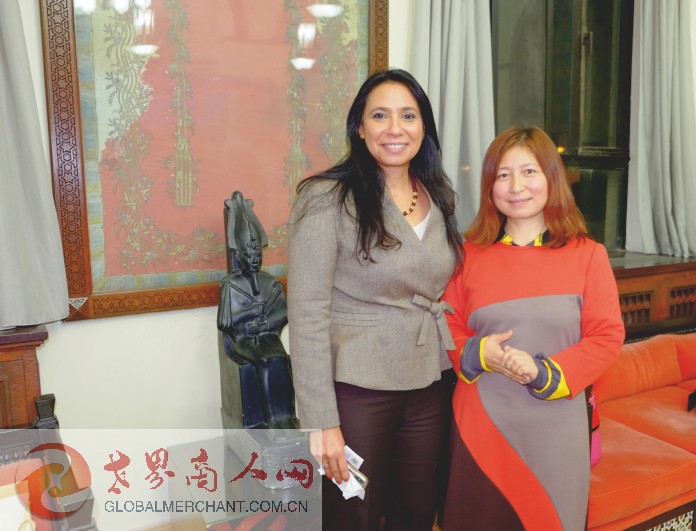 环球云链·世界商人网主编王晓玲向埃及驻华使馆全权公使,副馆长纳格拉·纳吉布女士在埃及文物新闻发布会后介绍环球云链国际旅行社和世界商人网并愉快合影