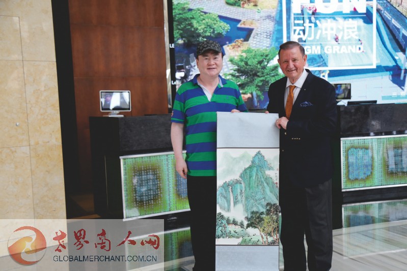 环球云链·世界商人网编辑记者,著名画家韩义先生向马耳他驻华大使卓嘉鹰阁下赠画 : 《青山绿水》