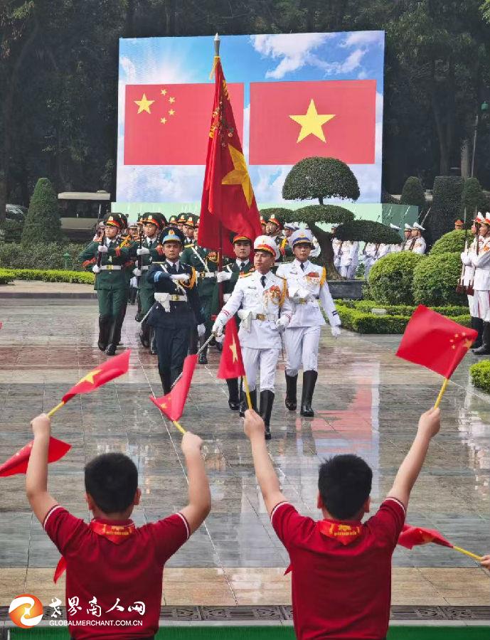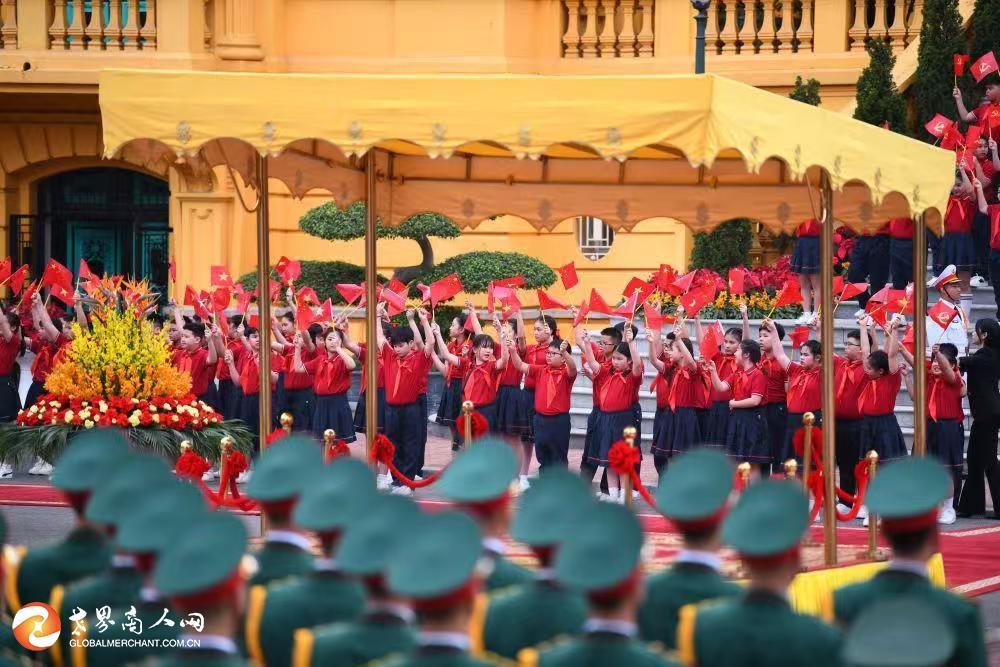 四月的河内,林木葱郁,生机盎然。主席府广场上,五星红旗同金星红旗迎风飘扬,200多名越南少年儿童挥舞旗帜,热烈欢迎习近平到访。