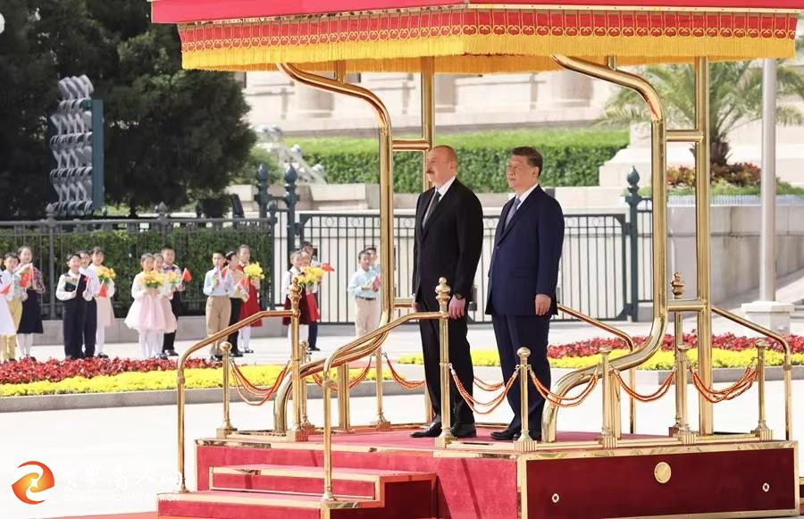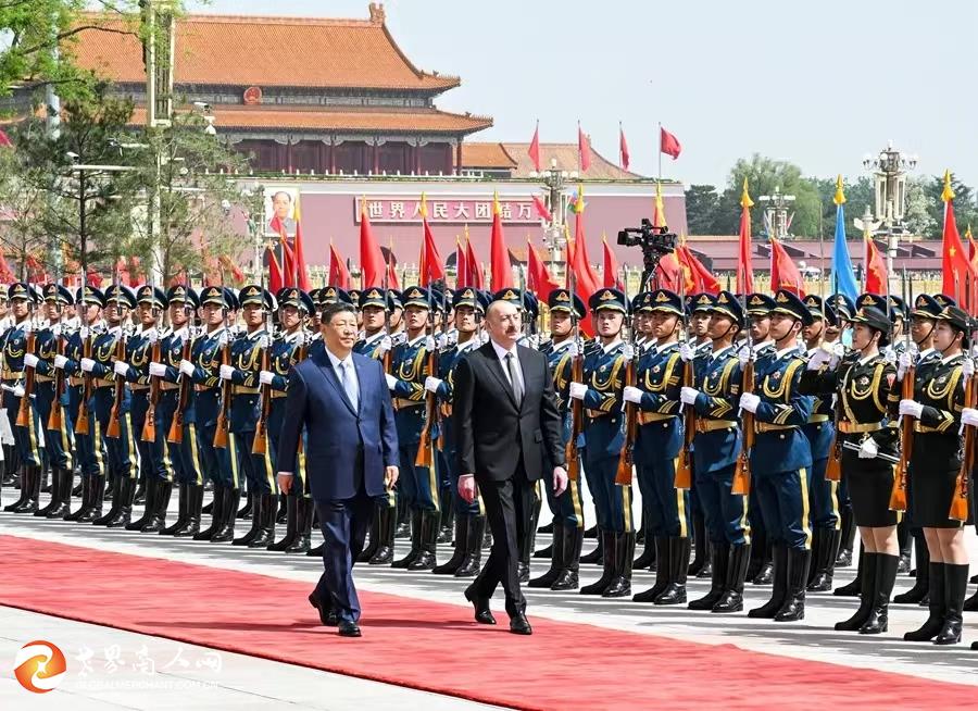 阿利耶夫抵达时,礼兵列队致敬。习近平同阿利耶夫登上检阅台,军乐团奏中阿两国国歌,天安门广场鸣放21响礼炮。阿利耶夫在习近平陪同下检阅中国人民解放军仪仗队,并观看分列式。