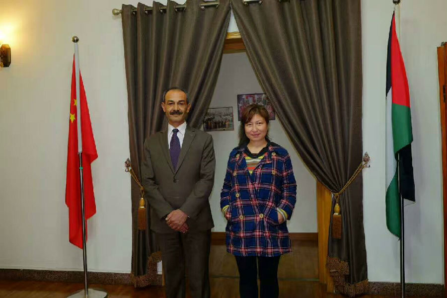世界商人网董事总经理兼总编王晓玲与巴勒斯坦驻华使馆政务官salah shehab先生在巴勒斯坦驻华使馆商谈合作并合影留念