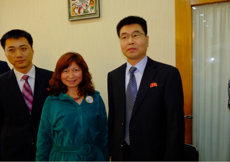 世界商人网董事总经理兼总编王晓玲与参加第24届纪念卢旺达图西族人民大屠杀仪式的朝鲜武官合影