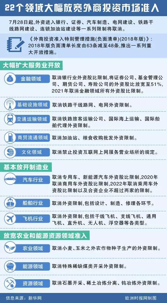 从7月28日起,外资进入银行、证券、汽车制造、电网建设、铁路干线路网建设、连锁加油站建设等一系列限制将取消;中国国家发展改革委、商务部28日发布2018年版外商投资准入负面清单,在22个领域推出新一轮开放措施;《外商投资准入特别管理措施(负面清单)(2018年版)》是对《外商投资产业指导目录(2017年修订)》中的外商投资准入负面清单的修订,并单独发布。2018年版负面清单长度由63条减至48条,推出一系列重大开放措施;