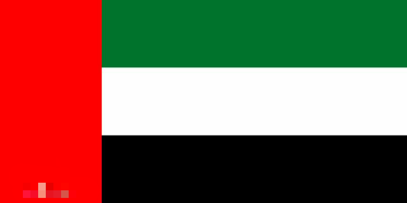 阿拉伯联合酋长国国旗 (The United Arab Emirates)呈横长方形,长与宽之比为2∶1,由红、绿、白、黑四色组成,这四色是泛阿拉伯颜色,代表穆罕默德后代的几个王朝。旗面靠旗杆一侧为红色竖长方形,右侧是三个平行相等的横长方形,自上而下分别为绿、白、黑三色。红色象征祖国,绿色象征牧场,白色象征祖国的成就,黑色象征战斗。1971年12月2日首次升起。