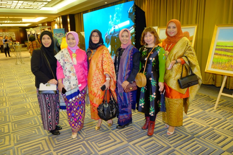 环球云链、世界商人网董事总经理王晓玲与身着华丽民族服饰的印尼女士在印尼大型招待晚宴迎宾厅合影