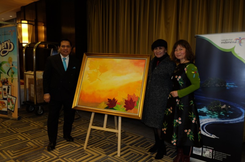 环球云链、世界商人网董事总经理王晓玲与印度尼西亚驻华大使周浩黎阁下及夫人围着大使夫人的画作一起愉快合影