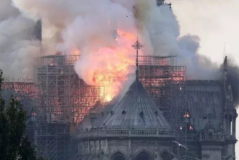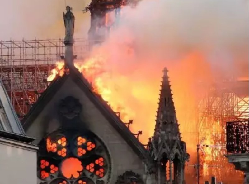 在火灾中,火焰使得教堂标志性的尖顶倾斜到一侧,然后坍塌到燃烧的屋顶上,这让火势迅速蔓延到大教堂。煤烟和灰渣则不断落在围观的市民身上。