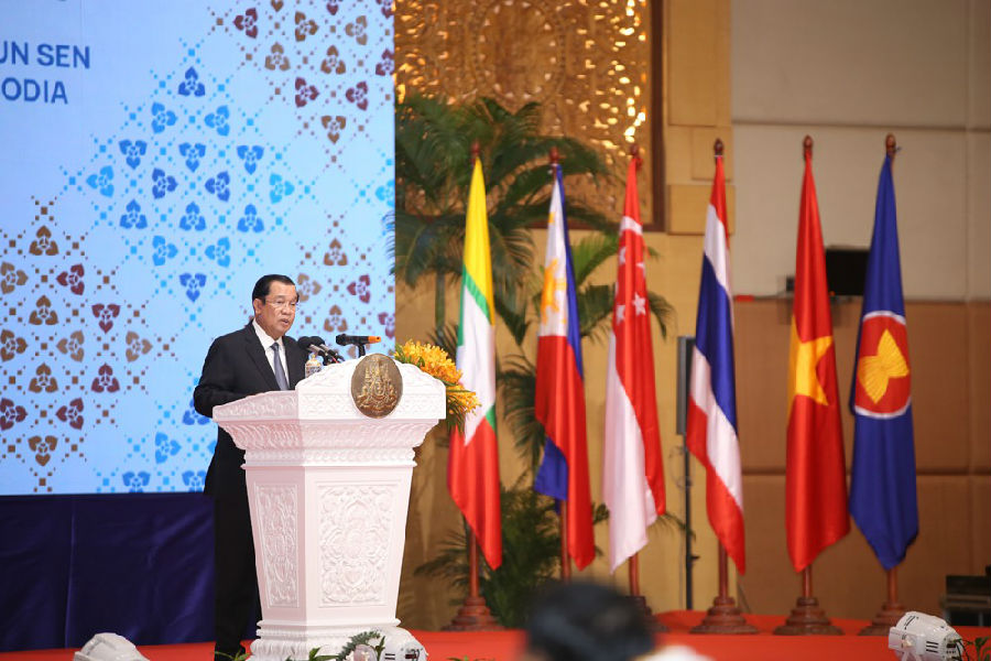 8月3日,柬埔寨首相洪森在首都金边举行的东盟外长会议上发言。