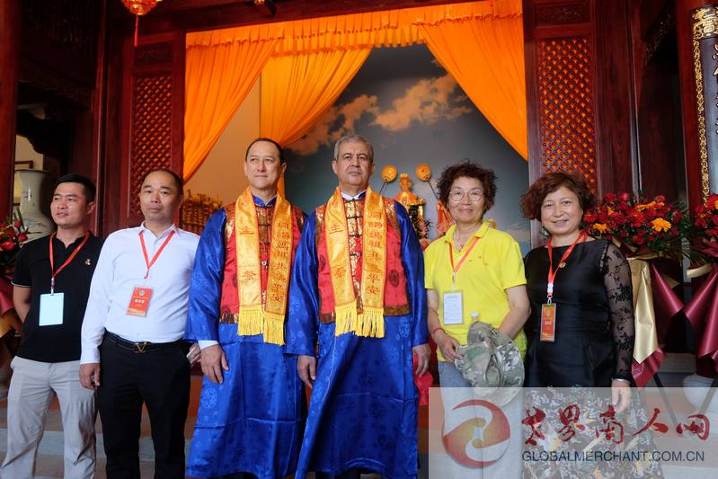 2022"妈祖秋祭"文化系列活动开幕式暨秋祭大典活动圆满举行,世界商人网总编、环球云链国际旅行社社长王晓玲与毛里求斯共和国驻华大使王纯万阁下,阿尔及利亚驻华大使阁下及中华妈祖文化交流协会领导在懿明楼妈祖神像前合影