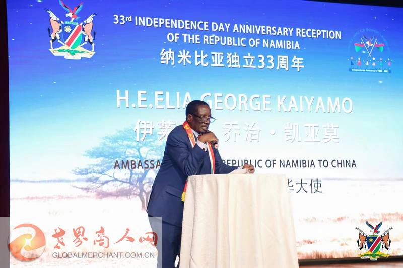 2023年3月21日,纳米比亚共和国独立33周年国庆招待会在北京隆重举行!纳米比亚驻华大使伊莱亚·乔治·凯亚莫阁下、纳米比亚内政和移民、安全和安保部执行主任Etienne Maritz先生,国防武官佩斯特·钱贾先生携纳米比亚使馆全体外交官,热情欢迎八方宾朋。中华人民共和国外交部副总干事周平先生作为中方主宾出席并致贺词。