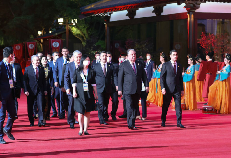哈萨克斯坦总统托卡耶夫、吉尔吉斯斯坦总统扎帕罗夫和夫人扎帕罗娃、塔吉克斯坦总统拉赫蒙、土库曼斯坦总统别尔德穆哈梅多夫、乌兹别克斯坦总统米尔济约耶夫和夫人米尔济约耶娃抵达紫云楼前。