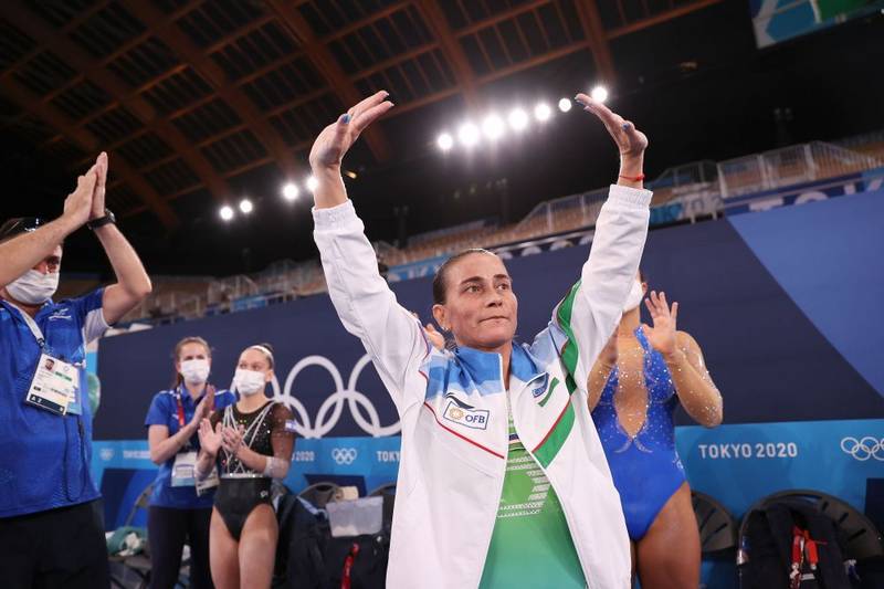 2021年7月25日,46岁的乌兹别克斯坦体操名将丘索维金娜在东京奥运会体操女子资格赛后向观众挥手致意。新华社记者 曹灿 摄
