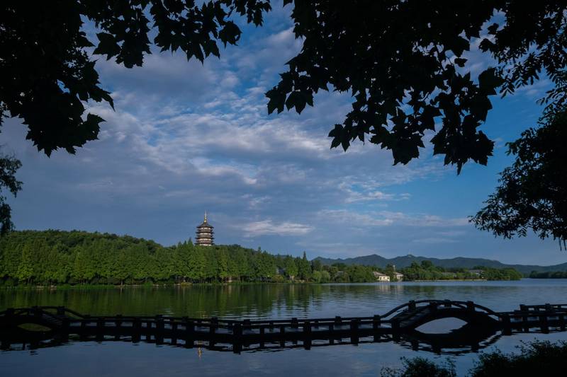 晨曦中的杭州西湖景区,雷峰塔沐浴在晨光中(2020年7月7日摄)。新华社记者 徐昱 摄