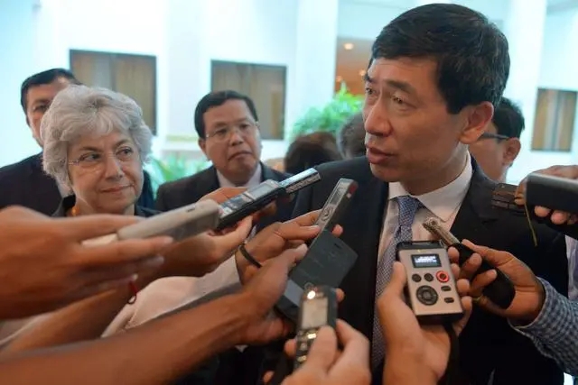 资料图:当地时间2014年4月29日,柬埔寨金边,徐浩良(右)向媒体发表讲话。图/视觉中国
