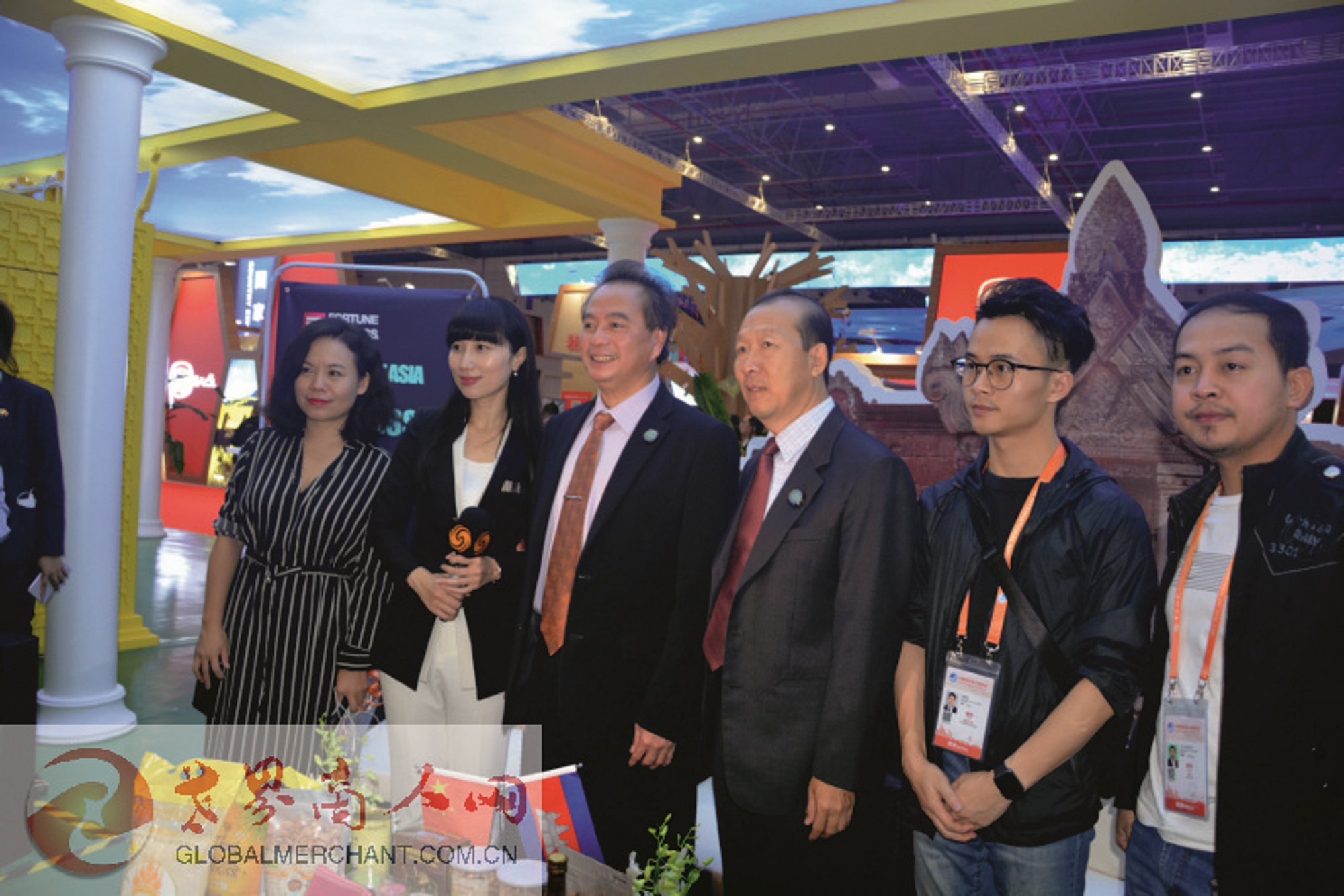 第二届中国国际进口博览会国家展展区内的柬埔寨展位:柬埔寨商务部长秘书接受媒体采访后合影