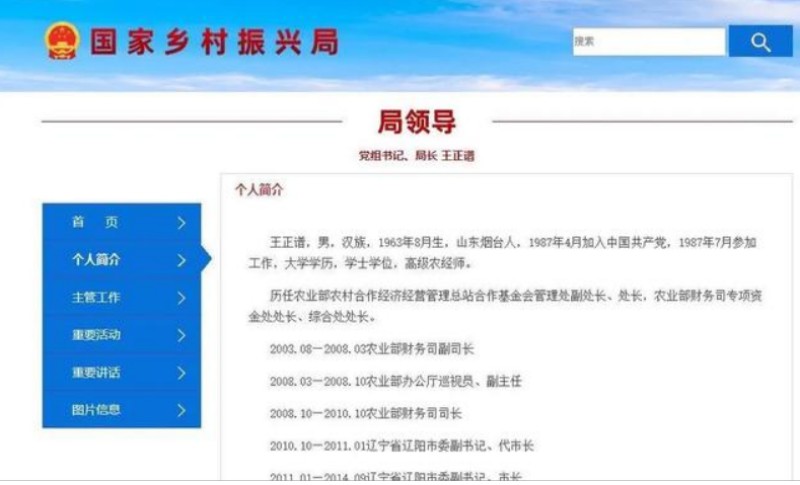 据官网显示,王正谱在今年1月已担任中央农村工作领导小组成员兼办公室副主任,农业农村部党组成员,国家乡村振兴局党组书记、局长。他原任四川省委常委、组织部部长。