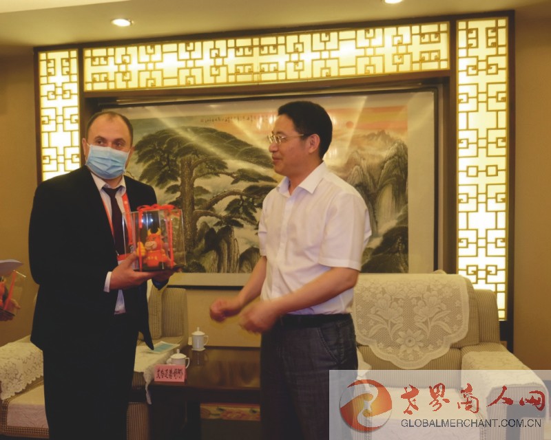 摩尔多瓦驻华大使馆一等秘书伊戈尔·方多斯先生代表摩尔多瓦国家接受运城市长储祥好赠送的运城面制吉祥牛