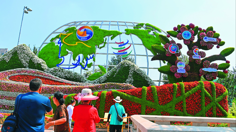 今年6月,游客参观位于北京东单体育场旁的“走向世界”花坛。(图片来源:中新社资料图)