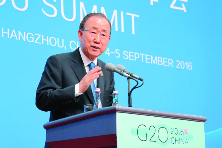 2016年9月4日,时任联合国秘书长潘基文来杭州参加G20杭州峰会,图为潘基文在新闻发布会上发言。(图片来源:中新社)