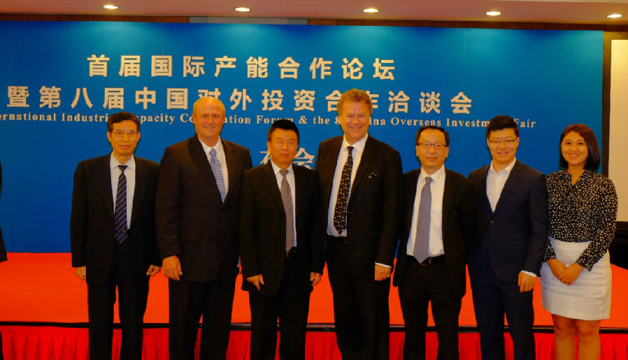 首届国际产能合作论坛暨第八届中国对外投资合作洽谈会组委会秘书长和振伟先生(左3)与加拿大百德维尔国际发展有限公司商务发展副总裁Mike O'Bright先生(左2)以及部分会务组成员合影