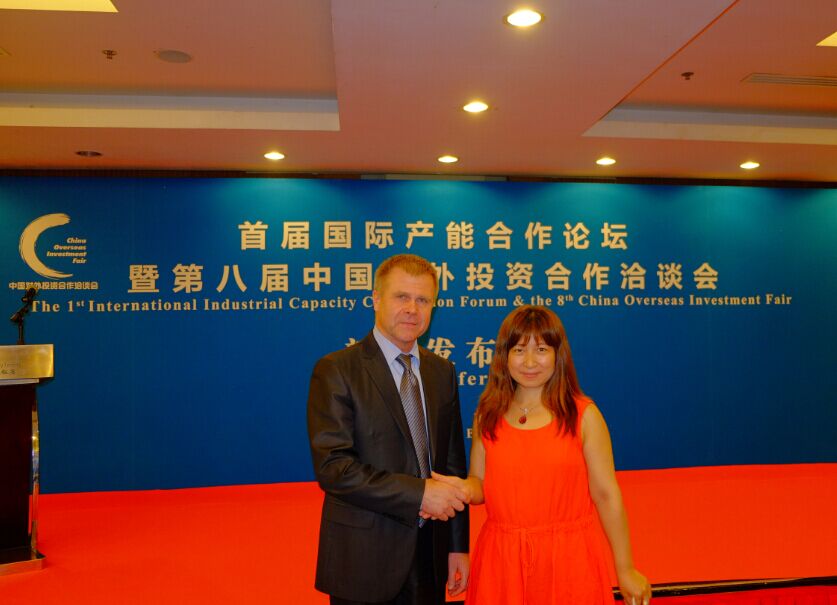 世界商人网主编王晓玲与俄罗斯联邦驻华商务副代表索罗金.谢尔盖先生首届国际产能合作论坛暨第八届中国对外投资合作洽谈会新闻发布会上洽谈合作并合影