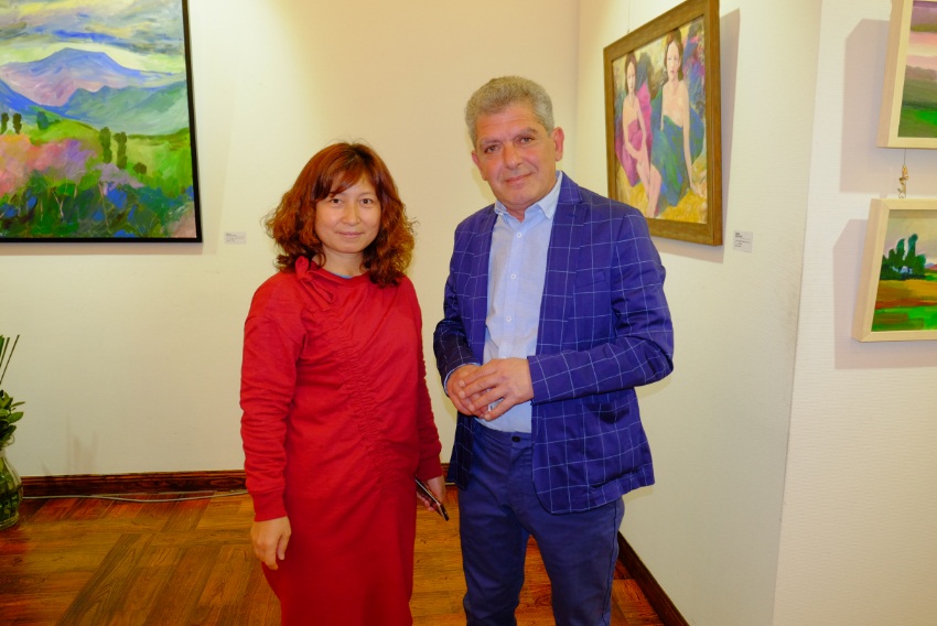 环球云链董事总经理及总编王晓玲与亚历山大·德拉杨2018新年作品展主办单位奥加美术馆董事长一同欣然合影