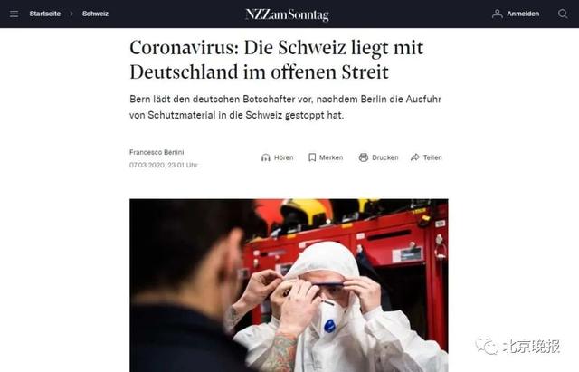 报道称,瑞士几乎不生产任何医疗耗材,该国市面上的口罩大多来自于远东地区,尤其是中国。这批被扣押的口罩是德国一家公司先从中国采购,瑞士公司购买了其中一部分,将其从德国运到瑞士,但德国的出口禁令切断了这一销售渠道。报道表示,这同时影响了对欧盟和非欧盟国家的口罩出口。