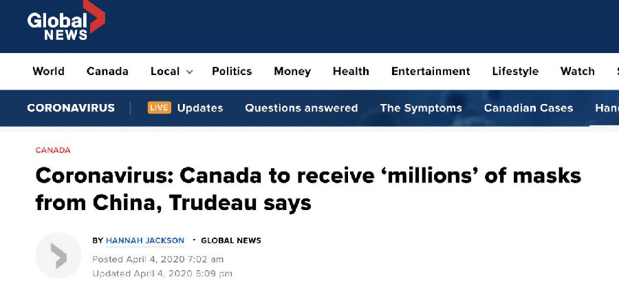加拿大《环球邮报》4日报道,加拿大总理特鲁多宣布,将从中国接收“数以百万计”的医用口罩。特鲁多称,在接下来的48小时内,加拿大将从中国租用货运航班运送数百万个口罩。加拿大还租赁了中国的一个仓库,以“尽快”收集和分发其他物资。