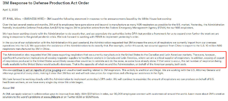 声明指出,3M是加拿大和拉美国家极为重要的口罩供应商,此时切断对这些国家医护人员的口罩供应,会产生严重的“人道后果”。这种做法也可能引起其他国家的报复和仿效,反过来影响美国本土的口罩和其他医用产品的供应。