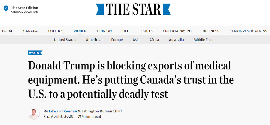 加拿大《多伦多星报》报道称,这一举动会让加拿大和美国之间的信任面临致命考验。加拿大公共服务和采购部长安妮塔·阿南德表示,美国禁止3M出口口罩这一举措,意味着同样的政策可适用于呼吸机、疫苗等所有产品的供应。在加拿大经济与美国经济融合了三十多年之后,这种风险从未像现在这样清晰。