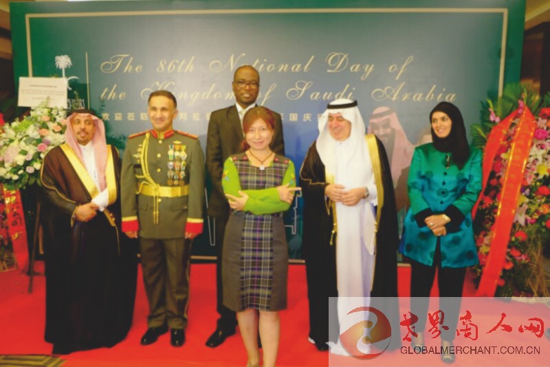 环球云链·世界商人网董事总经理王晓玲与沙特阿拉伯驻华大使图尔基·艾勒马迪阁下携夫人率领的迎宾团在沙特86周年国庆招待会合影留念(资料)