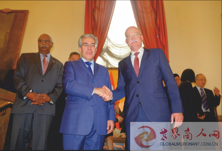 环球云链·世界商人网主编王晓玲向埃及驻华大使穆罕穆德·巴德里阁下介绍世界商人网的农业产业项目并愉快合影
