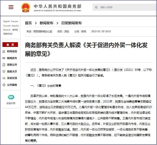 近日,国务院办公厅印发了《关于促进内外贸一体化发展的意见》(国办发〔2021〕59号,以下称《意见》)。商务部有关负责人就《意见》相关问题进行了解读。