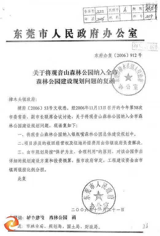 上图为市政府作出的《关于将观音山森林公园纳入全市森林公园建设规划问题的复函》